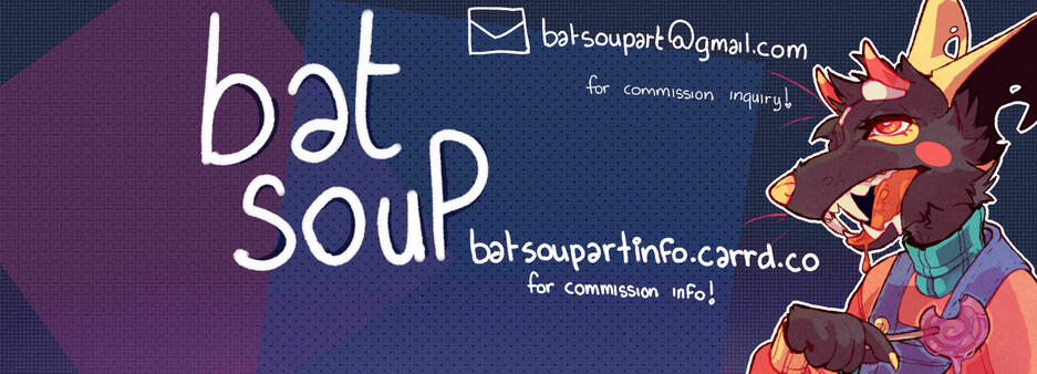 Commission Info for @batsoupart on twitter!I now have a google form that you can complete! If you have any further questions or information after filling the form out, please email me at [email protected]!I now have a public queue on trello!
